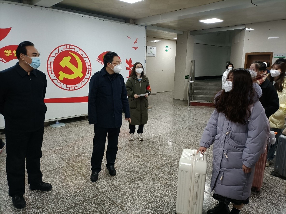 1月23日上午,党委书记刘岭、校长杨帆到高新校区,听取高新校区学生寒假离校返乡工作汇报,组织召开留校学生座谈会,现场解决学生学习生活困难,并到乘车点欢送学生离校返乡,叮嘱同学们注意安全、做好防护,挥手告别并送去新春的祝福!副校长和新盈全程陪同。