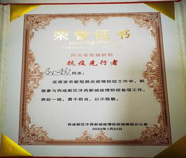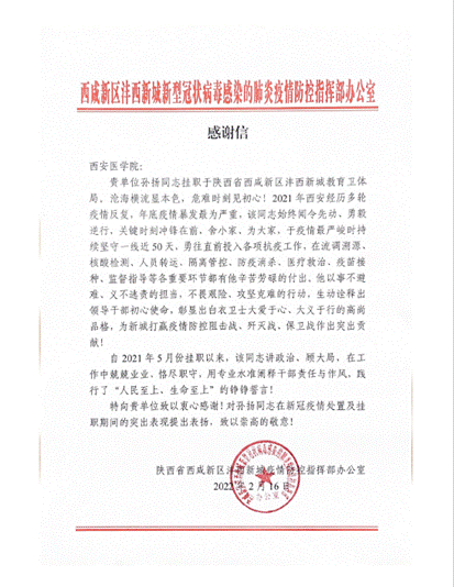 近日,陕西省西咸新区沣西新城疫情防控指挥部向我校发来感谢信,对我校选派的党外挂职干部孙扬在新冠疫情处置及挂职期间的突出表现表示衷心的感谢。孙扬同志荣获“西安市疫情防控抗疫先行者”荣誉称号。