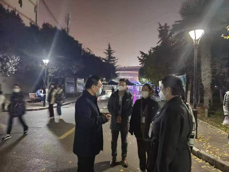 (党宣快讯)19日晚10:00,党委书记刘岭、副书记姚文柱带队慰问值班值守干部和辅导员,督导巡查校园疫情防控工作,先后到图书馆、教学楼、生活区食堂、学生公寓楼等重点区域检查门禁管理和防疫措施落实情况。强调要进一步夯实责任,以高度负责的态度落实落细各项防控举措,织密织牢疫情防控网,确保师生生命安全和身体健康。20日晚,刘岭、姚文柱深入教学楼、学生公寓看望学生并与球迷同学共享卡塔尔世界杯足球赛开幕式和首场球赛盛宴。校学工部暖心为学生观众准备了苹果及饮用水,各学院学工干部、辅导员陪伴收看并组织暖场节目,营造了有序欢乐的观看氛围。随后,校领导一行深入学生公寓巡查稳定安全工作,重点到2号、6号男生公寓楼看望值班值守学工干部和辅导员,叮嘱大家强化世界杯球赛期间的疫情防控意识,做好敏感时期学生思想教育管理工作。