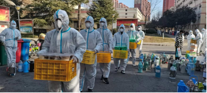 400名忙碌的“小白”,我不知道他们的名字,也看不清他们的容貌,我只知道他们从早上六点开始,要为一万名学生送上一日三餐,要为1700个宿舍送去近7000瓶热水,要保障每个同学基本的生活用品,要疏导每名学生每隔一日的核酸检测...